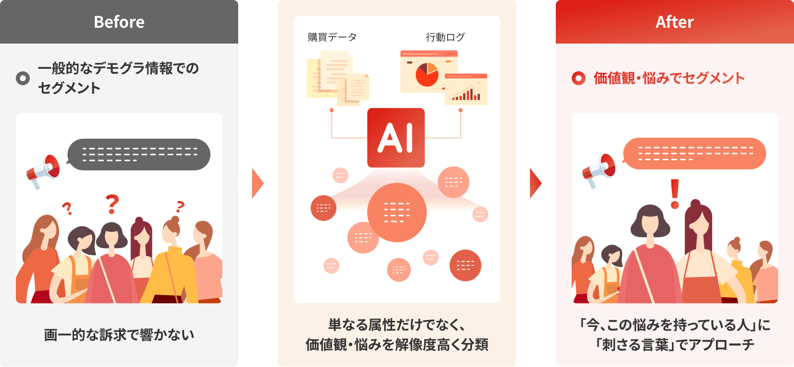 人力では不可能なレベルで顧客を細分化(最大47分類×購買ステージ)。「月3本」のメルマガ配信が「月30パターン※」の1to1配信へ。(※他社実績)