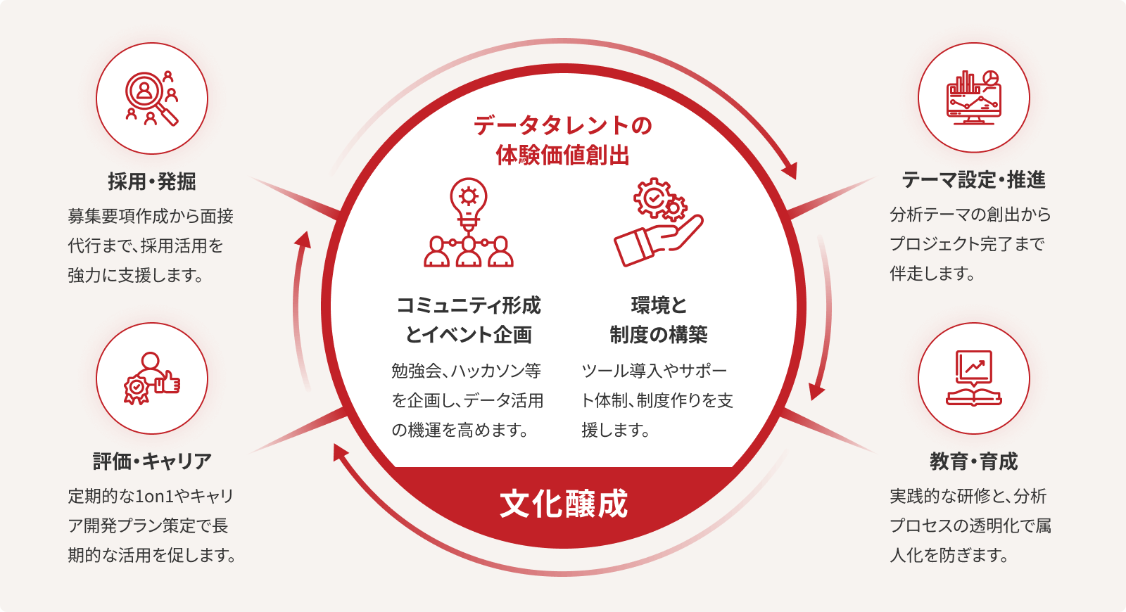 DX/データ活用を組織全体に浸透させる「文化醸成」を中心に、人材のライフサイクル全体をサポートします。